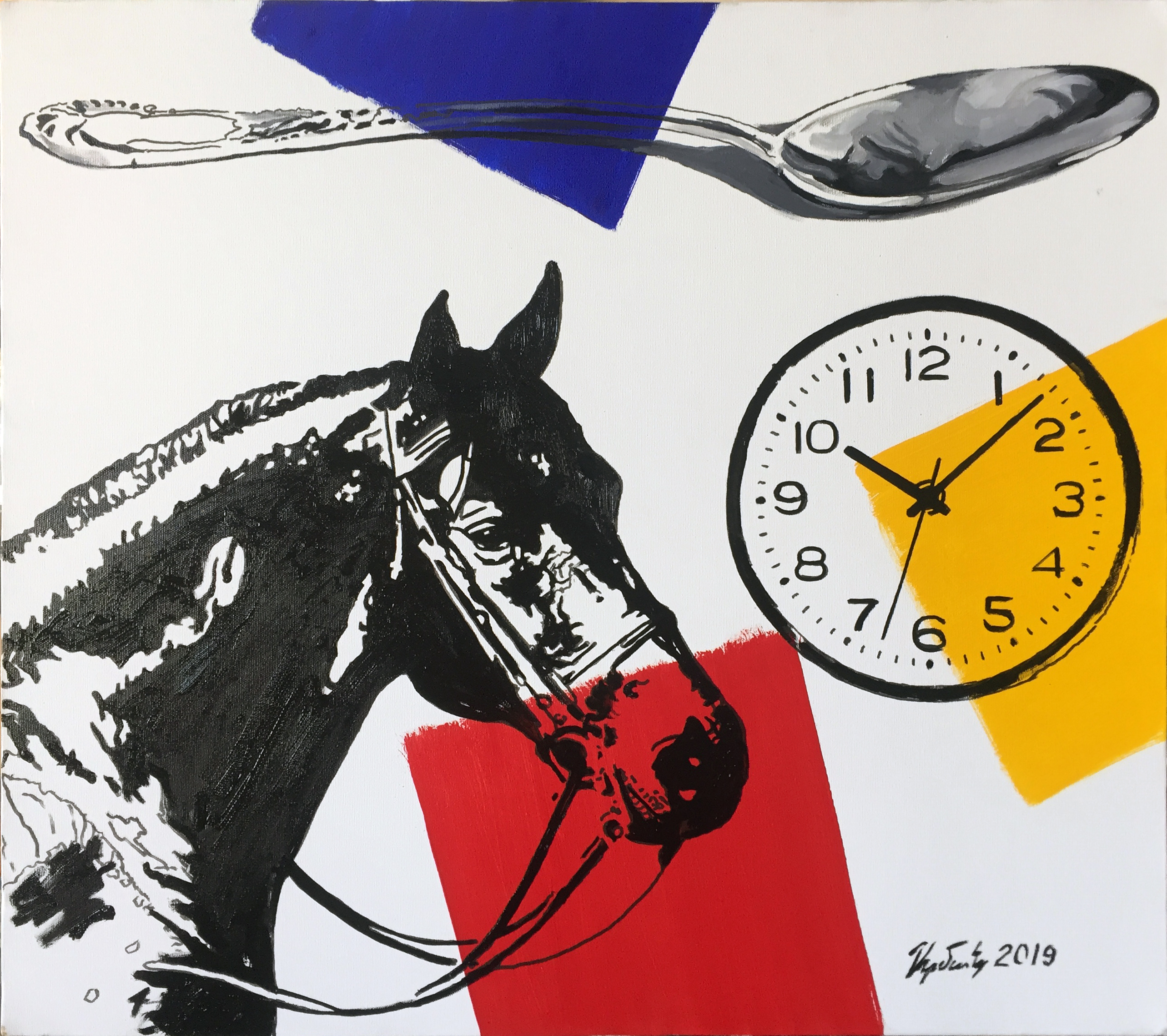 Arman Grigoryan – The Horse with Clock and Spoon, 2019, oil on canvas, 65x74cm